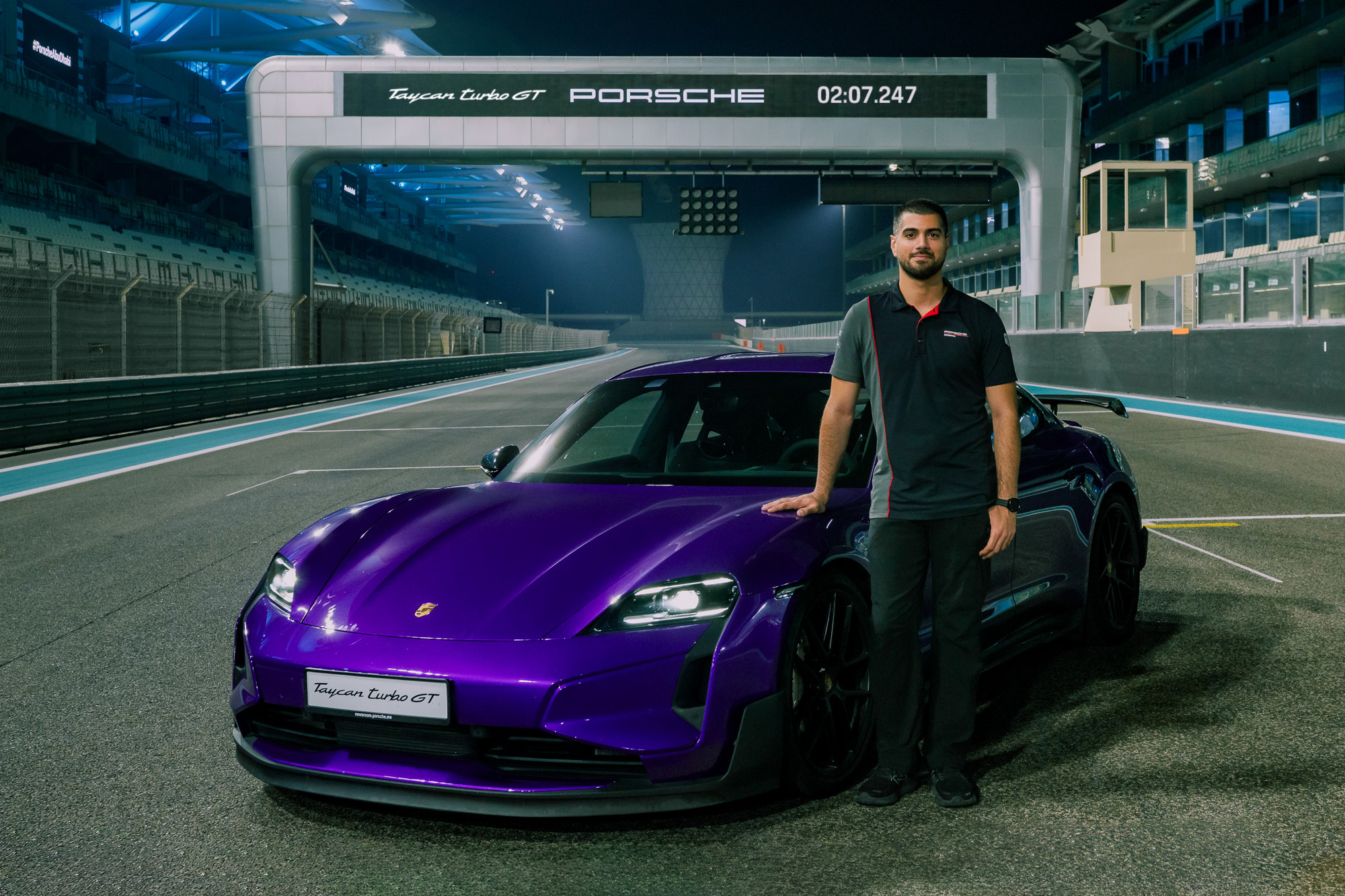 在阿联酋,由于亚斯码头赛道白天气温过高,圈速挑战在夜间进行。阿联酋 GT 赛车手兼赛车学校教练 Ramez Azzam 仅用2 分 7.2 秒便跑完了 5.281 公里长的F1赛道,仅比房车赛的赛车圈速纪录慢 1.1 秒。这项全新纪录使阿联酋赛车运动协会(EMSO)将 Taycan Turbo GT 的这项全新纪录正式认定为亚斯码头全程 GP 赛道上最快的量产电动车型。不断刷新的纪录展现了Taycan车型强大的综合性能实力。